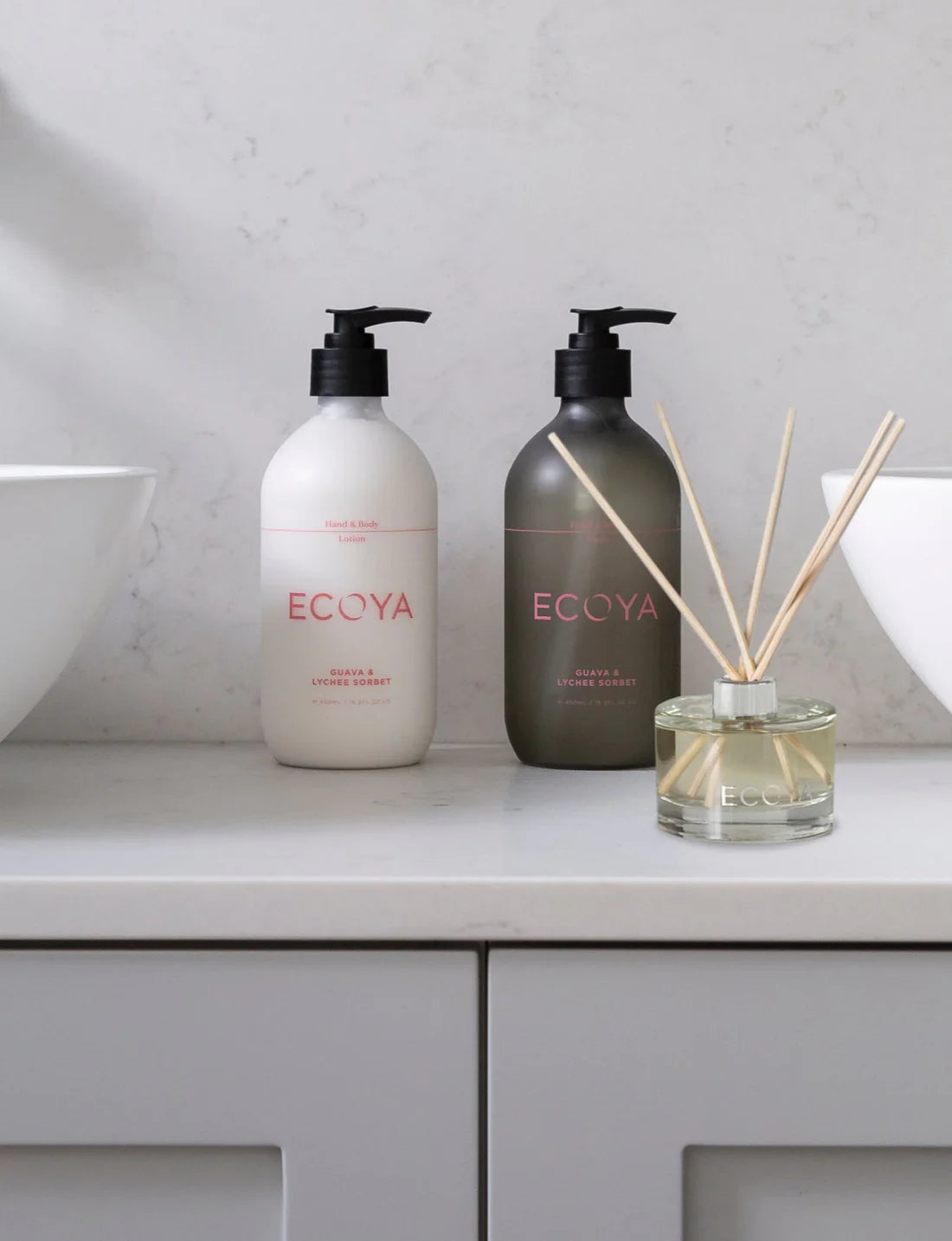 The essentials gift set includes our luxurious hand & body wash, hand & body lotion and mini diffuser in our best-selling fragrance, Guava & Lychee Sorbet.